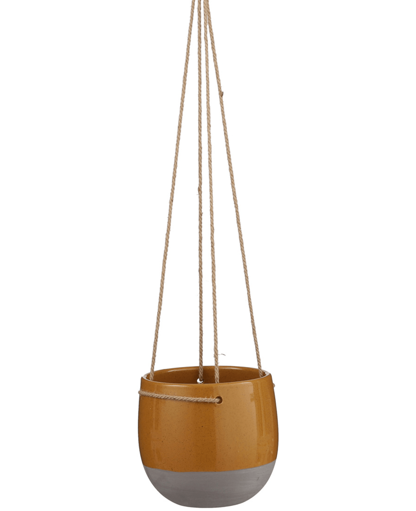 En nydelig henge potte i keramikk, den har fargen oker oppi og på utsiden, men neders har den grå keramikk synlig, en kjempe lekker hengende potte. Den er 81cm fra bunn av potte og opp til oppheng. Selve potten er 11,5cm høy og har en diameter på 12 i toppen.