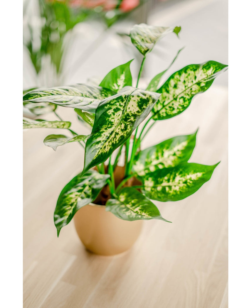 Kunstig Diffenbachia 40cm, denne er veldig fin og naturtro med sine detaljerte blader, bladene har en grønn frisk farge og kremhvite detaljer helt innerst mot stilken. Denne kunstige planten har flere ting som gir den lille prikken over i en, ikke bare de detlaljerte flotte bladene, men også den kule brune ''stammen'' som den springer ut fra, vi synes det er med på og løfte hele planten til et nytt nivå, den detaljen gjør hele planten litt ekstra fin og gjør at dette er en ordentlig blikkfanger. Den er ikke så stor, men den fyller likevel rommet.