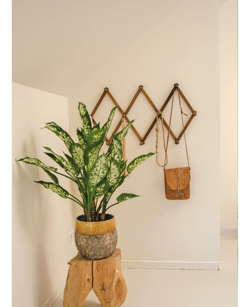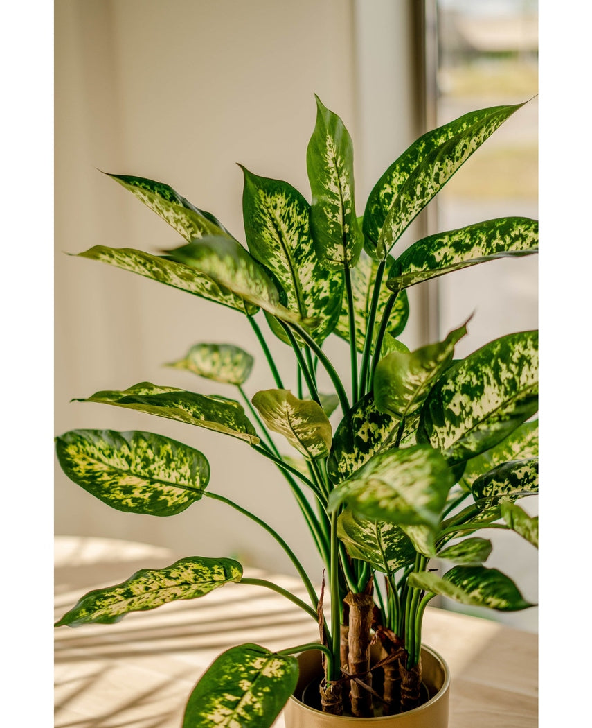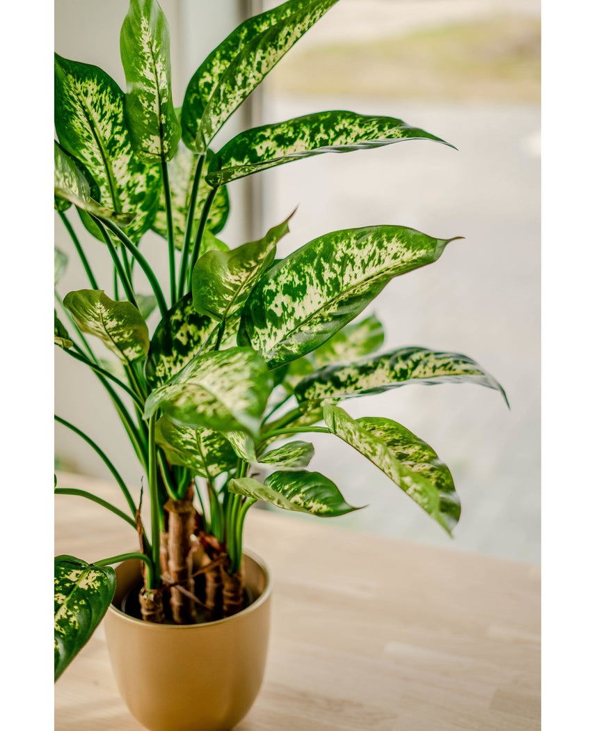 Kunstig Diffenbachia 68cm, storebroren eller søster til vår kunstige diffenbachia 40cm. Denne er veldig naturtro og flott med sine detaljerte blader, bladene har en grønn frisk farge og kremhvite detaljer helt innerst mot stilken, den har mange store flotte blader som alle springer ut i en flott bukett. Denne kunstige planten har flere ting som gir den lille prikken over i en, ikke bare de detlaljerte flotte bladene, men også den kule brune ''stammen'' som den springer ut fra, vi synes det er med på og løfte hele planten til et nytt nivå, den detaljen gjør hele planten...