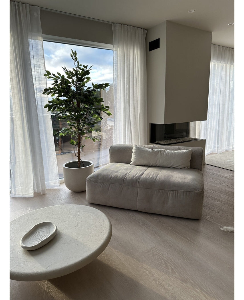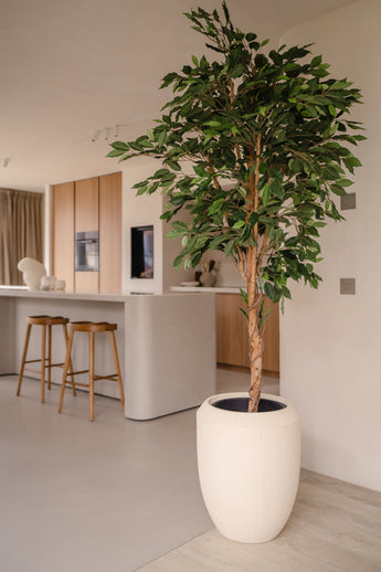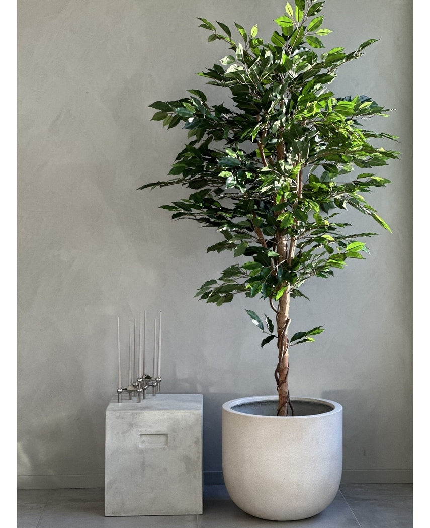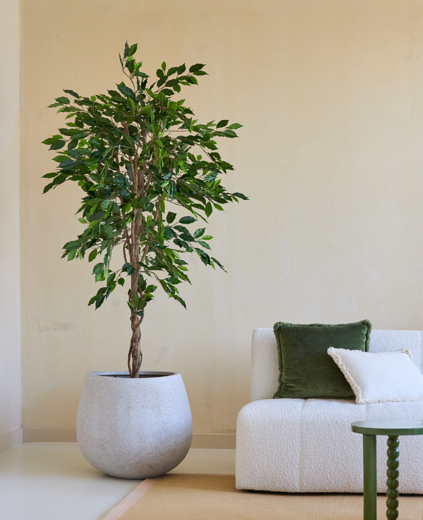 Våre kunstige trær er nesten umulig å skille fra ekte vare. Vi bruker polyester av høy kvalitet, mens stammene er laget av ekte tre, noe som skaper et veldig naturlig utseende. Er du fortsatt i tvil om kvaliteten? Da er du velkommen til å besøke utstillingslokalet vårt for å se dem selv!