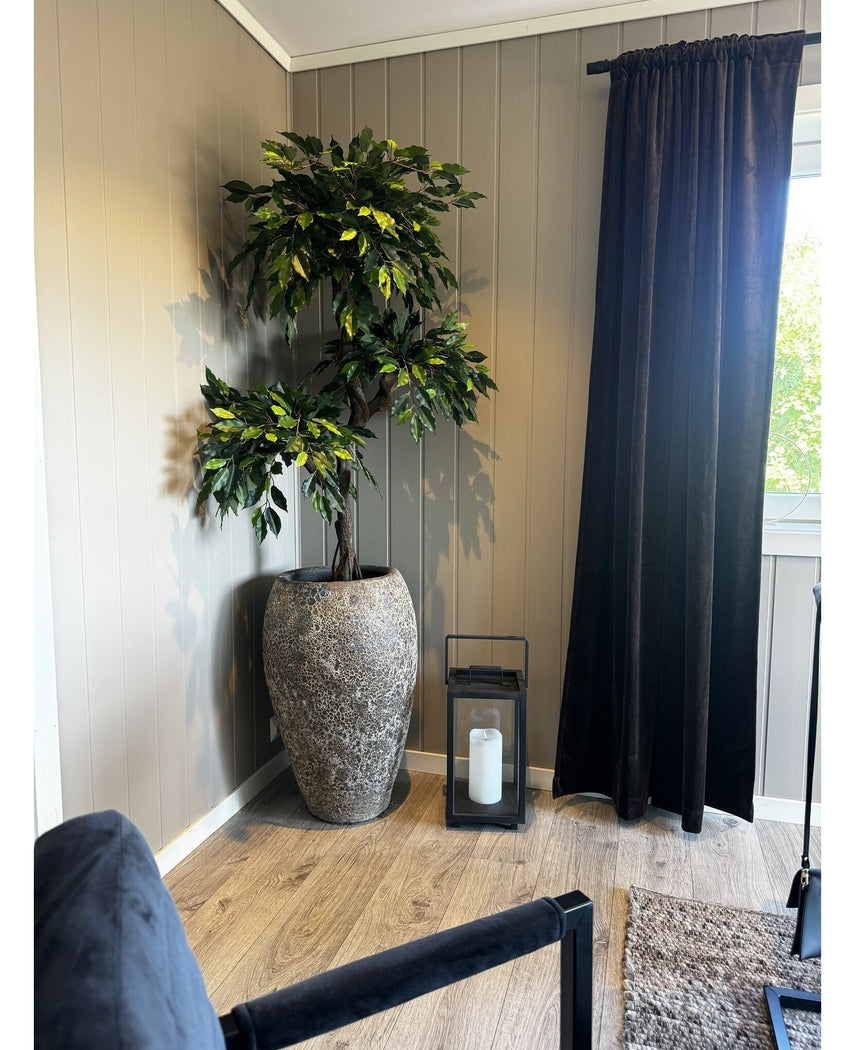 Er du ute etter et ordentlig blikkfang? Da har du funnet det. Vår kunstig fat fikus crazy er 120cm høy, stammen er ekte og den er utrolig unik nettopp grunnet dens spesielle form, den har tre grener med blader som ruver ut i forskjellige høyder på stammen som tilsammen utgjør er diameter på 55cm. Bladene er av førsteklasses kvalitet plast og tekstil, de er nøye detaljerte og har en nydelig rik grønnfarge, innimellom er det noen lysere blader som skal simulere ny vekst - alt dette sammen gjør denne kunstige planten utrolig naturtro.