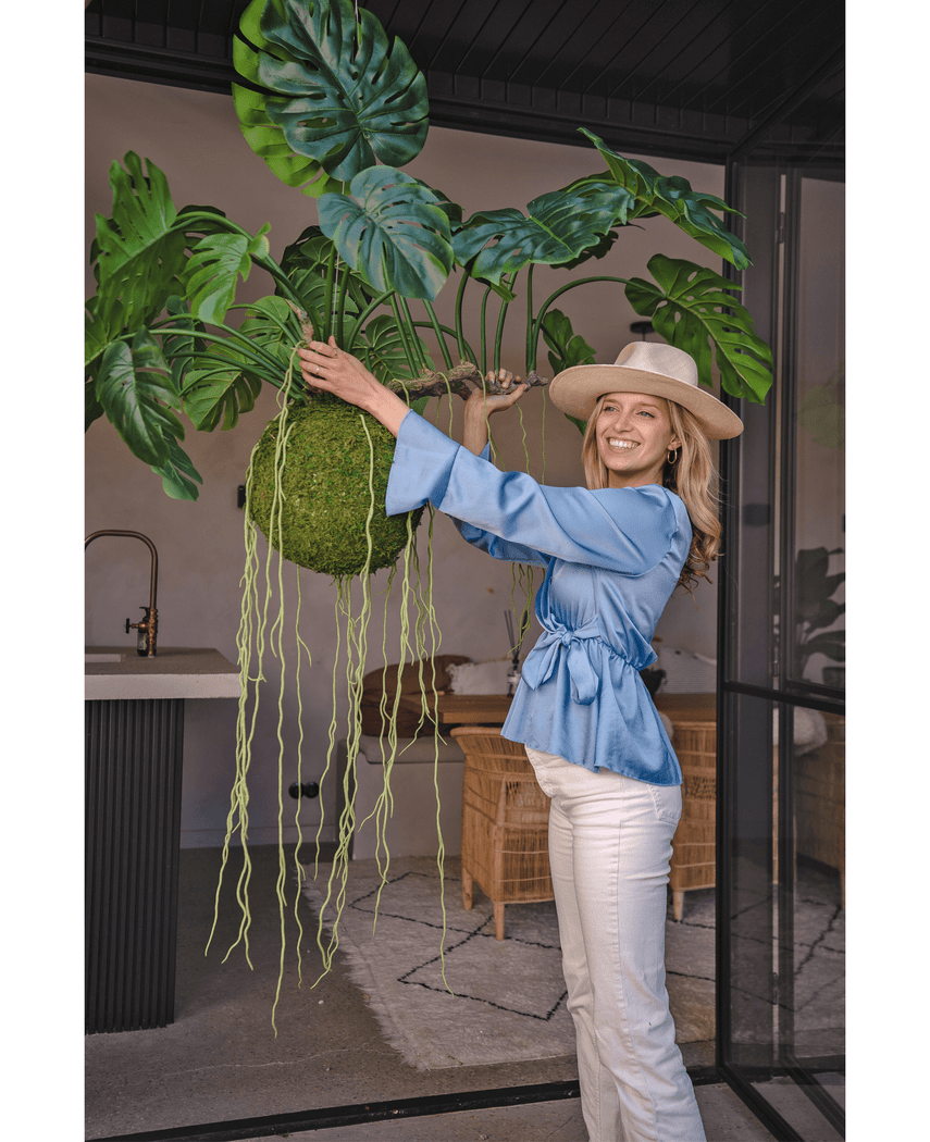 Har du ikke en potte til den kunstige hengeplanten din ennå, men har den kunstige hengeplanten din en pinne? Da kan du bruke en bit isopor eller oasis i potten for å feste hengeplanten godt. Avslutt med en fin topping for et velstelt utseende!