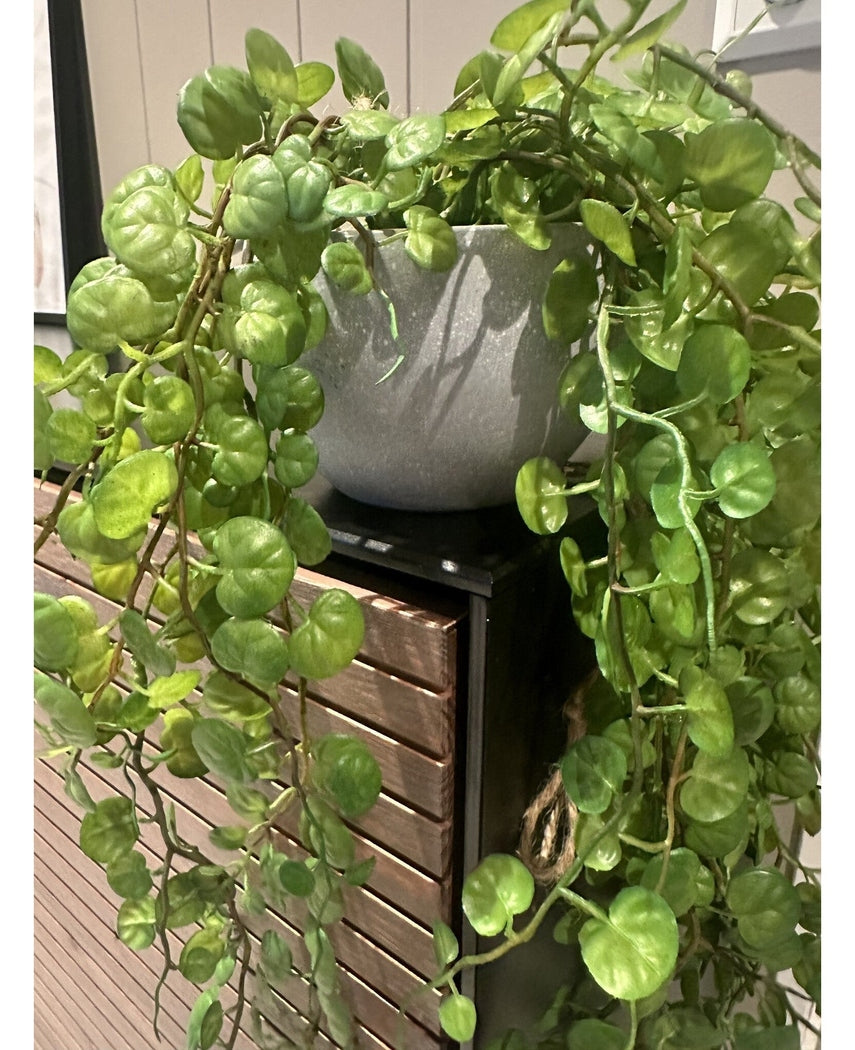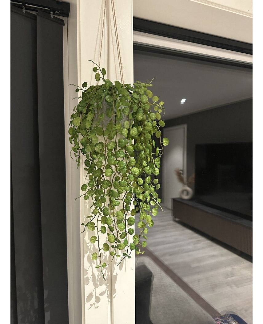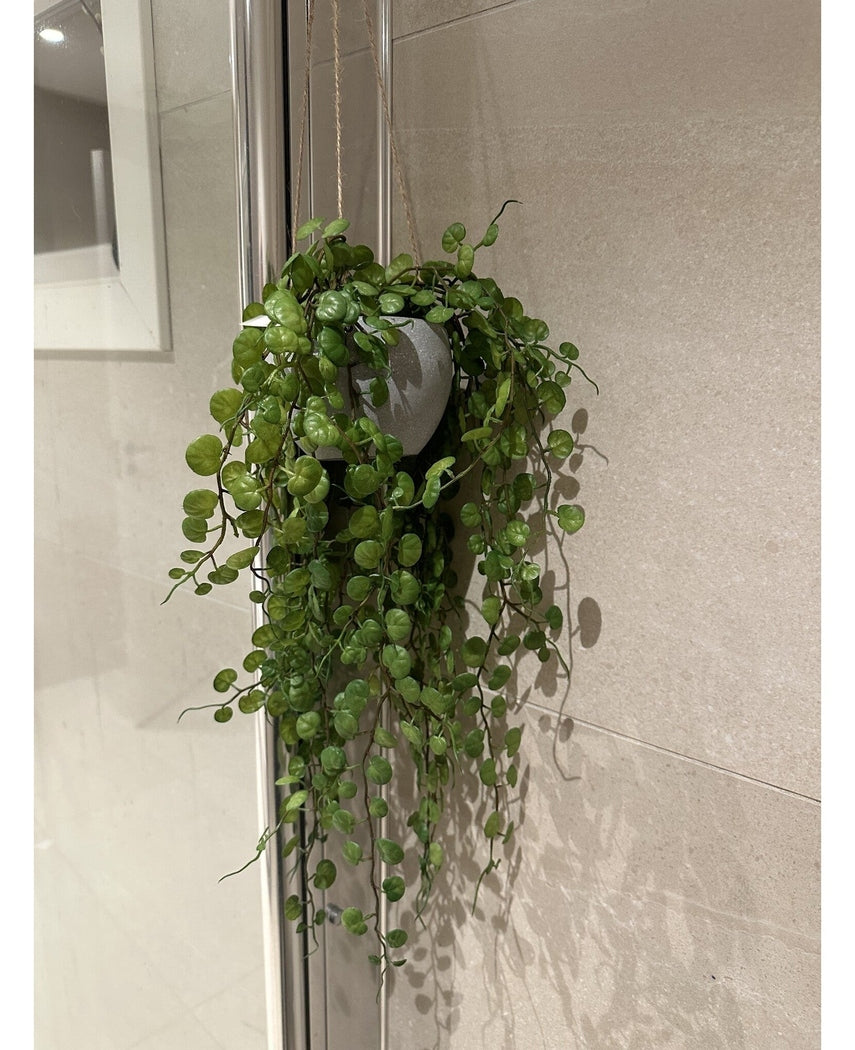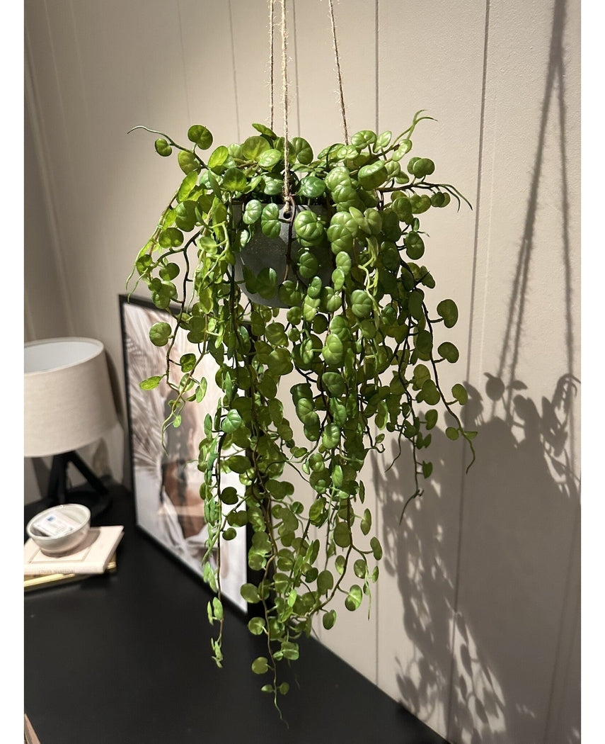 En nydelig kunstig hengeplante i Grå dekorpotte med tau-oppheng.