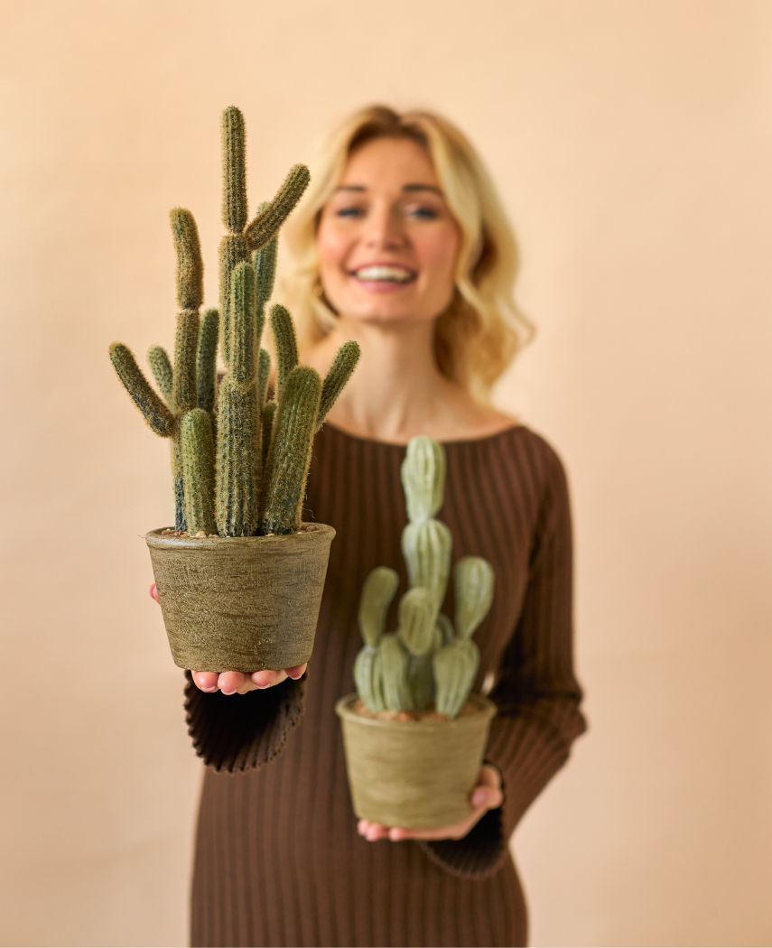 En moderne og naturtro søylekaktus som gir interiøret et stilrent, minimalistisk preg. Med sine detaljerte ribber og realistiske form skaper den et ekte ørkeninspirert uttrykk. Helt uten behov for sollys eller stell. Den leveres i potte og er enkel å plassere på hyller, skrivebord eller småbord. En smal og dekorativ plante som holder seg like flott år etter år.