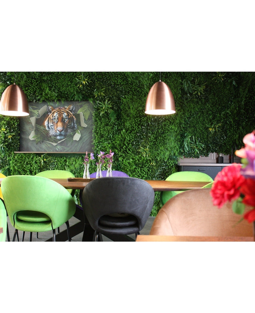 En nydelig grønn plantevegg til beundring. Kunstig "Crush" Plantevegg er en eksklusiv dekorvegg fylt med frodige kunstige grønne planter og busker. Mattene kan klippes og tilpasses etter kjøp til ditt formål.