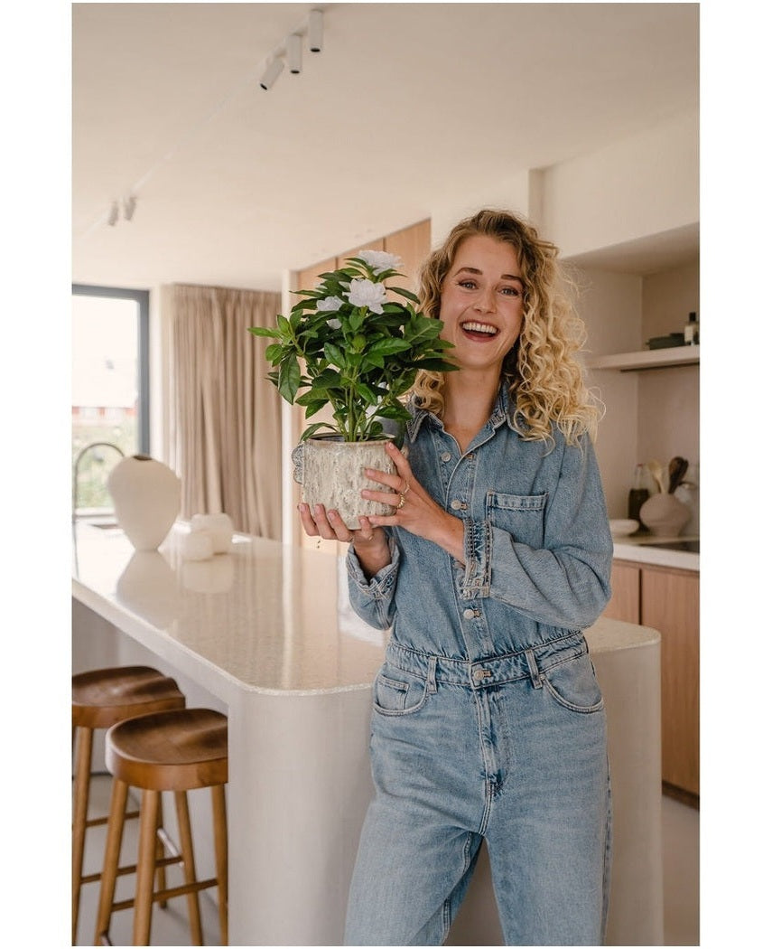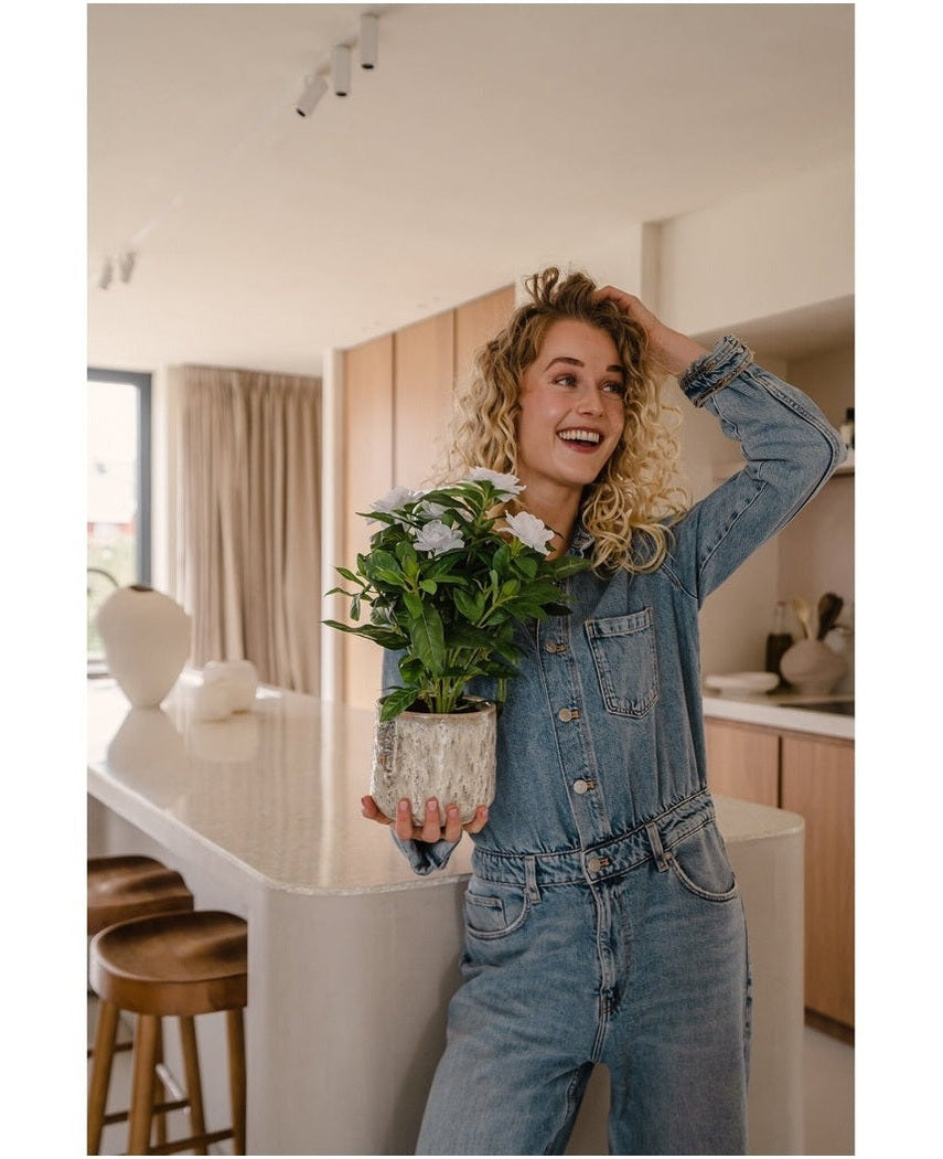 Skap en aura av subtil eleganse med vår Kunstige Plante Gardenia i en fortryllende hvit farge. Denne 39cm høye planten er et tidløst tillegg som legger til raffinement i ethvert innendørsrom.
